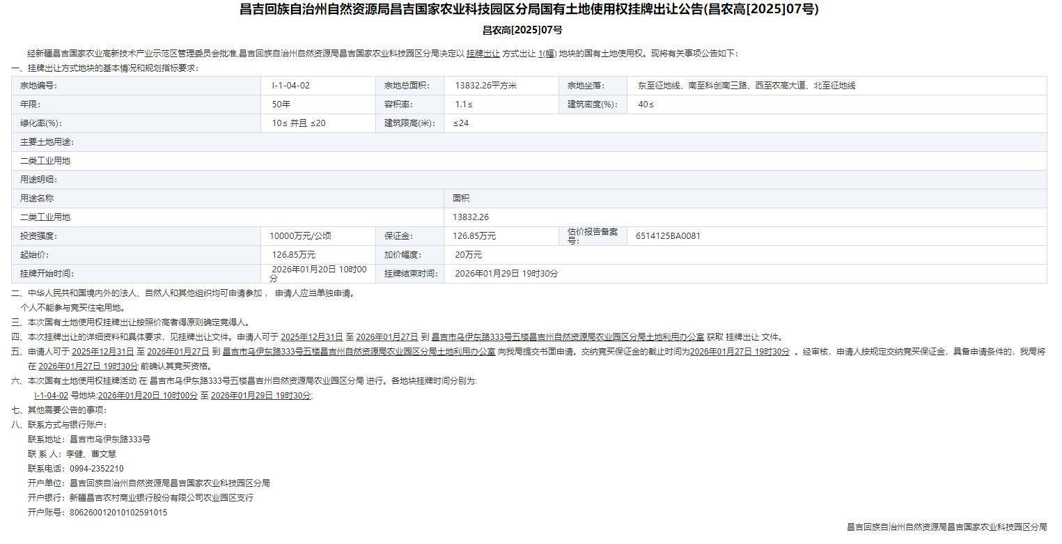 昌吉回族自治州自然资源局昌吉国家农业科技园区分局国有土地使用权挂牌出让公告