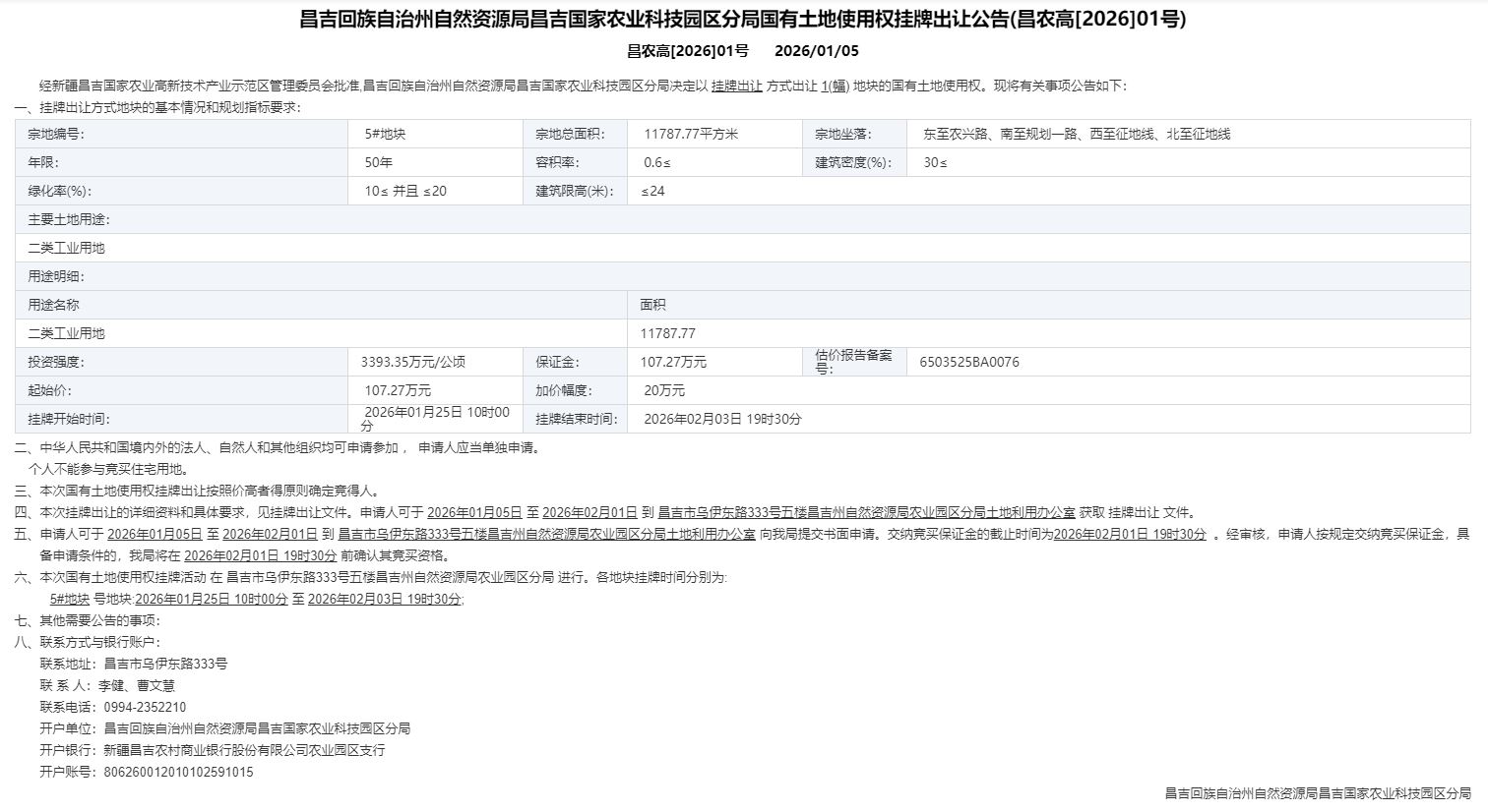 昌吉回族自治州自然资源局昌吉国家农业科技园区分局国有土地使用权挂牌出让公告