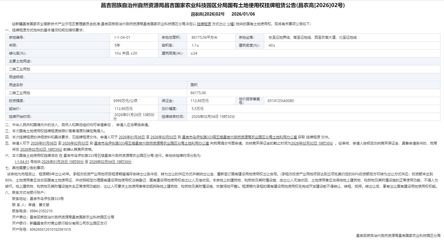 昌吉回族自治州自然资源局昌吉国家农业科技园区分局国有土地使用权挂牌租赁公告