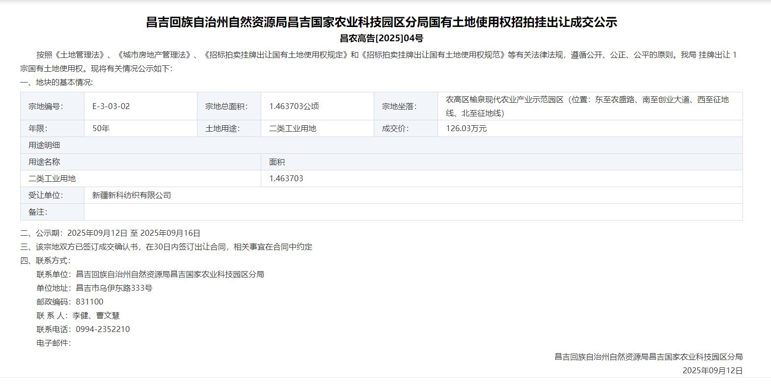 昌吉回族自治州自然资源局昌吉国家农业科技园区分局国有土地使用权招拍挂出让成交公示
