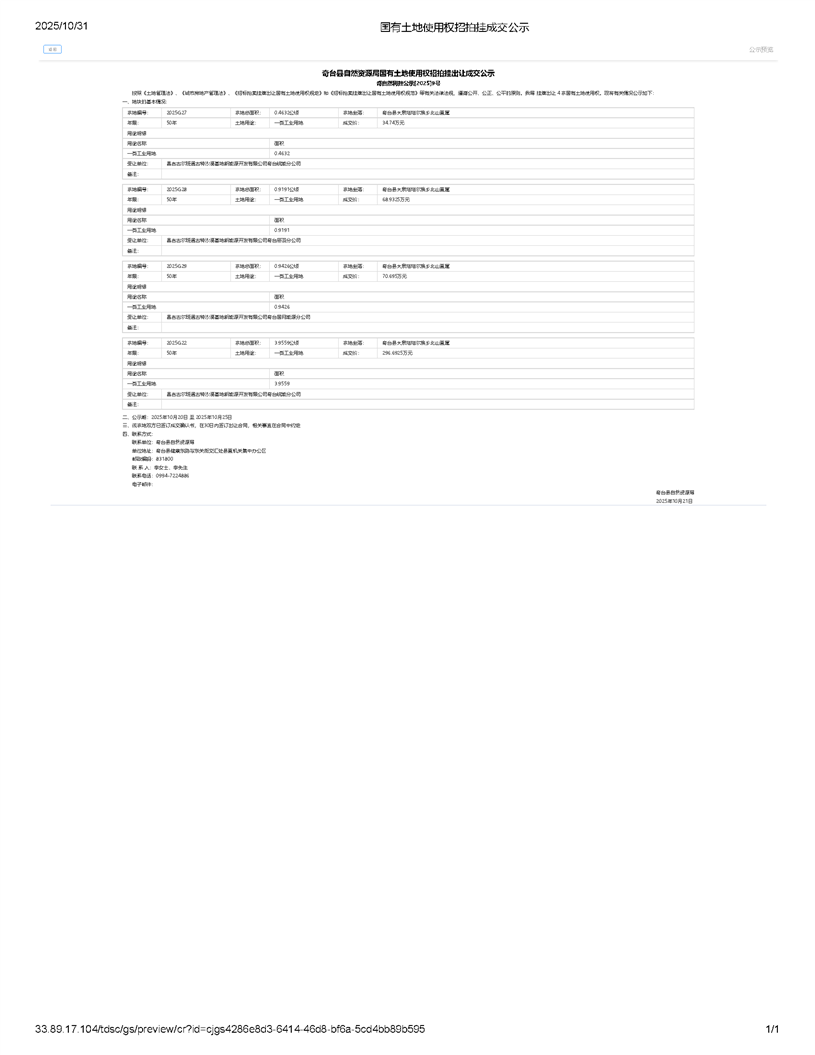 奇台县自然资源局奇自然利挂[2025]9号国有土地使用权挂牌出让公告成交公示
