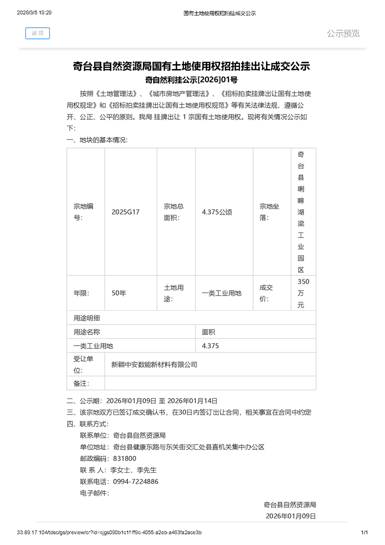 奇台县自然资源局国有土地使用权招拍挂出让成交公示(奇自然利挂公示[2026]01号)