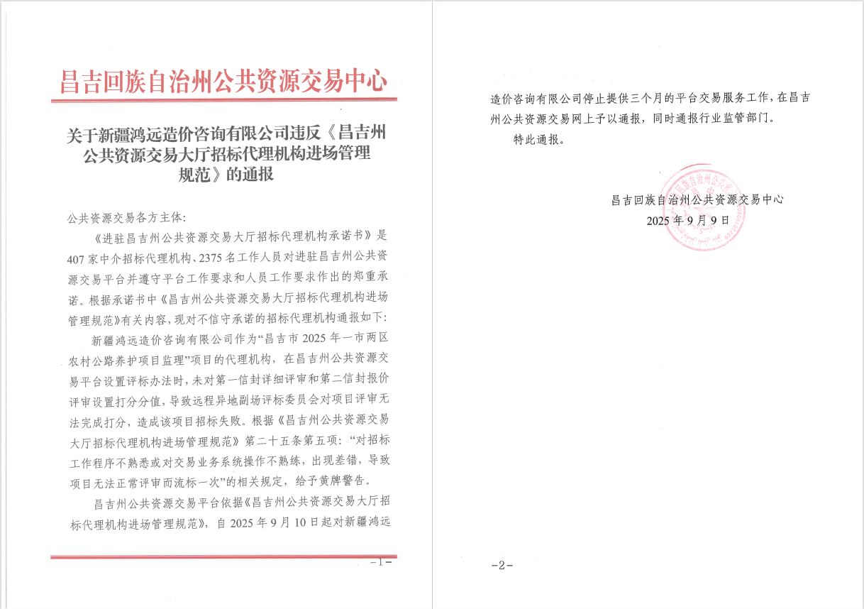 关于新疆鸿远造价咨询有限公司违反《昌吉州公共资源交易大厅招标代理机构进场管理规范》的通报