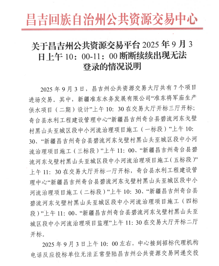 关于昌吉州公共资源交易平台2025年9月3日上午10:00-11:00断断续续出现无法登录的情况说明