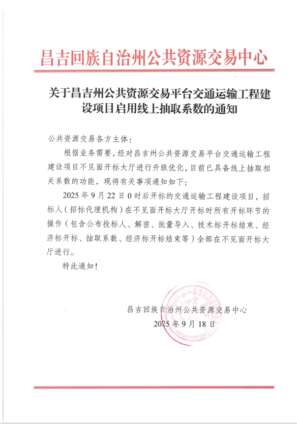 关于昌吉州公共资源交易平台交通运输工程建设项目启用线上抽取系数的通知