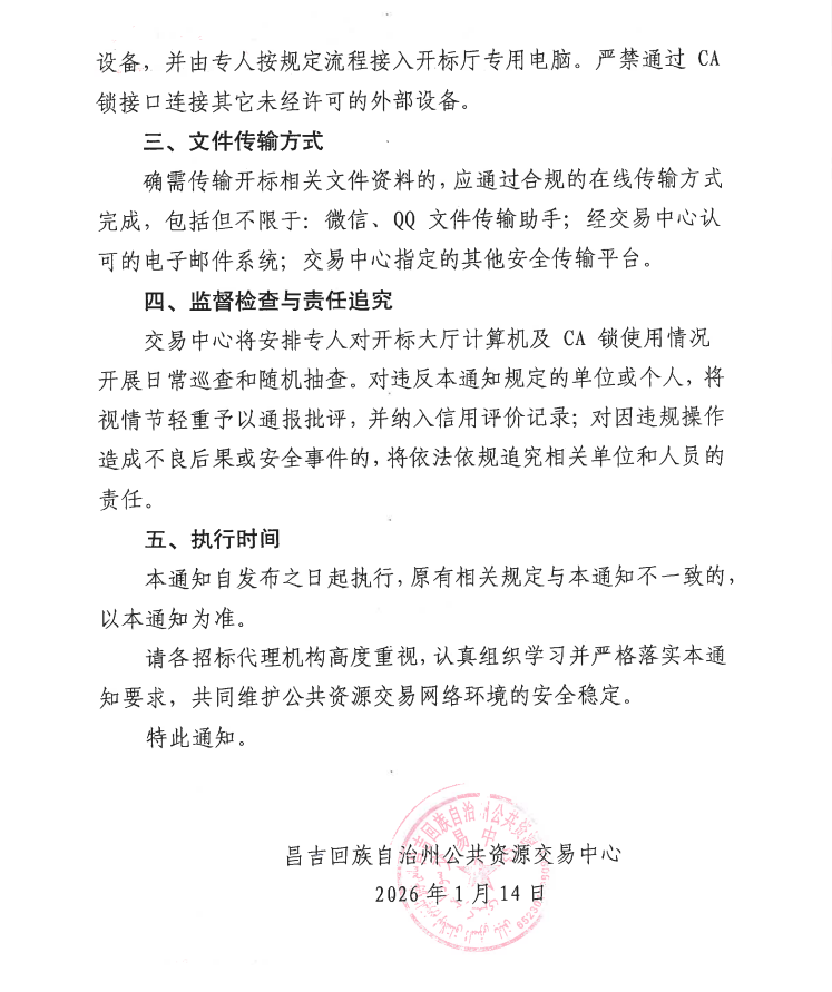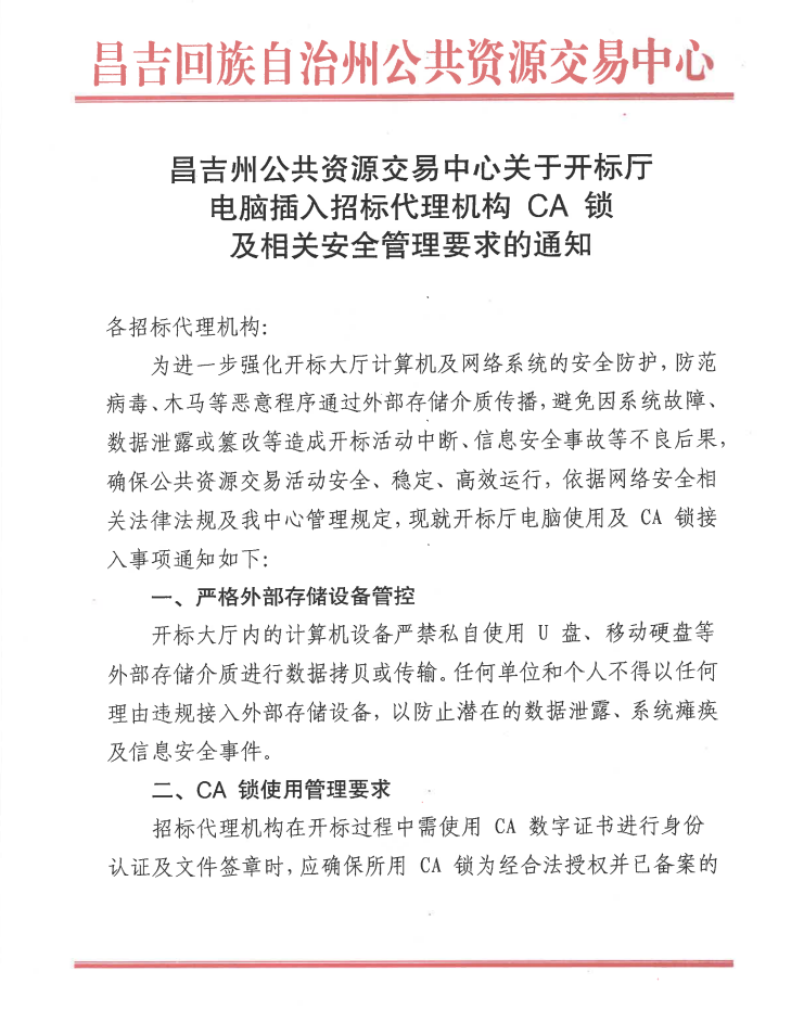 昌吉州公共资源交易中心关于开标厅电脑插入招标代理机构CA锁及相关安全管理要求的通知