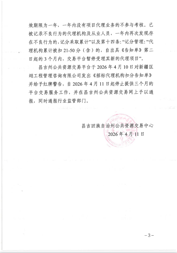 关于新疆匡翊工程管理咨询有限公司违反《昌吉州公共资源交易招标代理机构及从业人员暂行管理办法》的通报