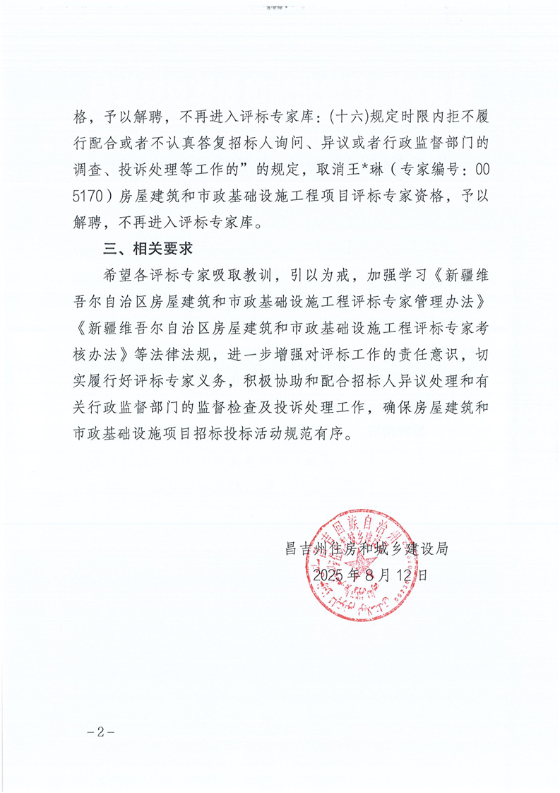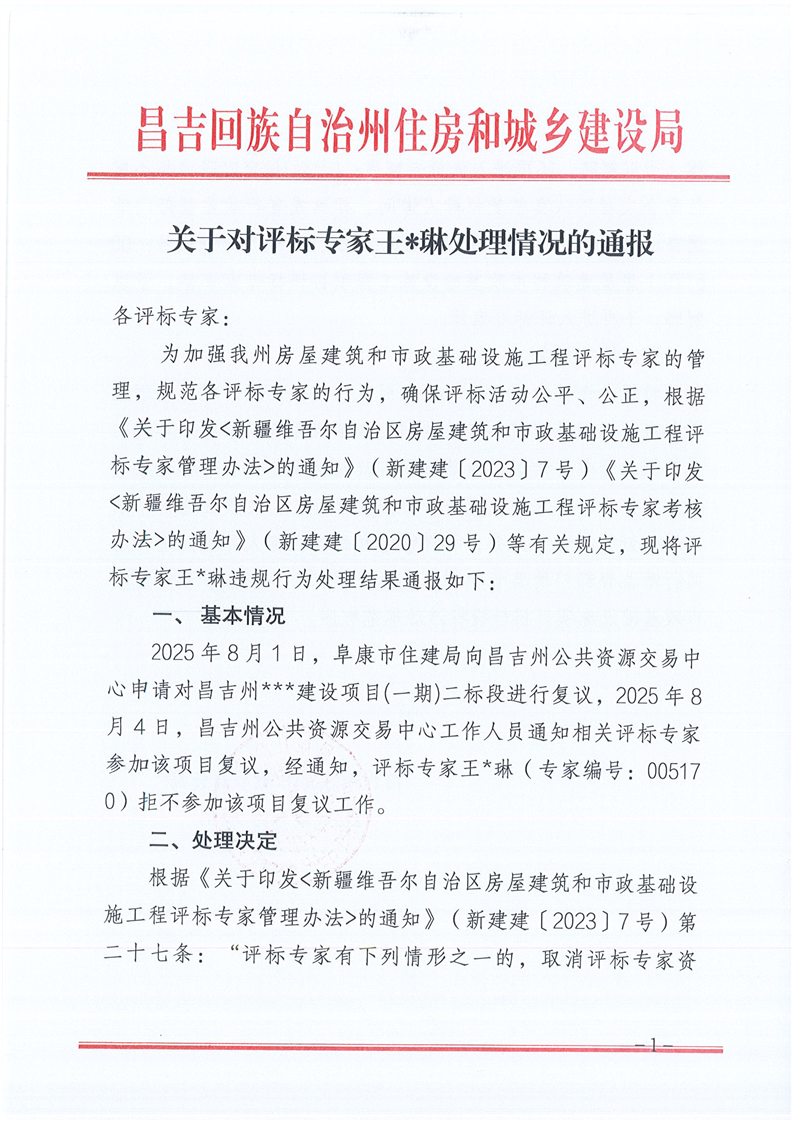 关于对评标专家王*琳处理情况的通报